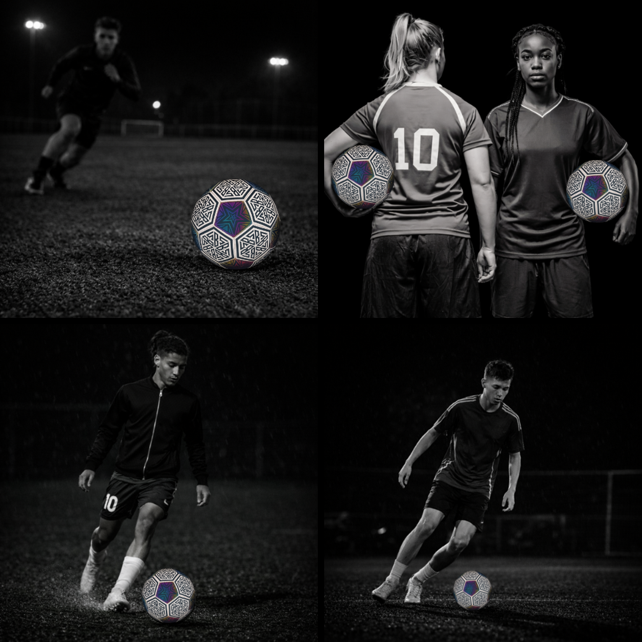 BallStar donne une nouvelle dimension au football classique. Grâce à son tissu holographique ultra réfléchissant, le ballon capte la lumière et brille dès que la nuit tombe.